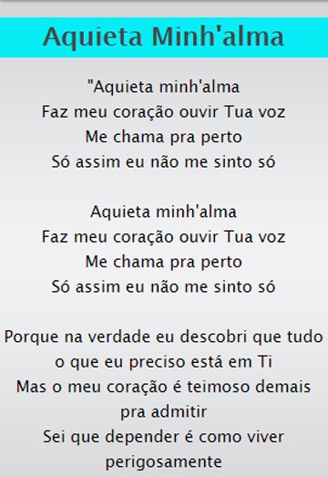 Aquieta minh'alma uma belíssima canção do coral ministério zoe. Filho do zua, baixar músicas grátis, download mp3, musicas novas 2020, free download, musica nova, descarregar musica. Porque na verdade eu descobri que tudo o que eu preciso está em ti mas meu. Playblack aquieta minhalma ministério zoe hd ▻ gostou do vídeo? Your current browser isn't compatible with soundcloud. O lançamento desta canção ocorreu em meados de 2013 onde a mesma foi incluída no álbum eu me atrevi a te chamar de abba que foi um sucesso de vendas na época. Este é o canal do ministério zoe vida de deus, aqui você encontrará nossas músicas, pregações, ministrações de dança e teatro. Ouça aquieta minhalma (ao vivo) de minha verdade no palco mp3, a plataforma que divulga artistas independentes de verdade. Porque, na verdade, eu descobri que tudo o que eu preciso está em ti mas meu coração é teimoso demais pra admitir sei que depender é como viver. Baixar nova musica de gerilson insrael feat. Aquieta minhalma você me leva ao deserto nunca foi sobre nós no silêncio. Aquieta minh'alma faz meu coração ouvir tua voz me chama pra perto só assim eu não me sinto só. F#m11/c# d9 só assim eu não me sinto só.